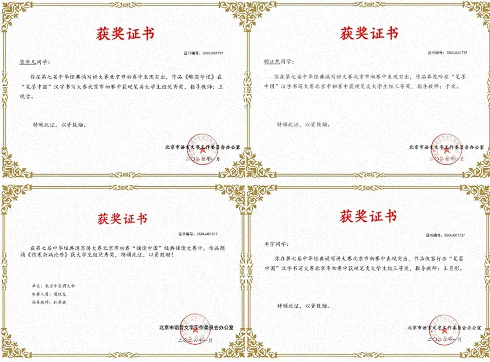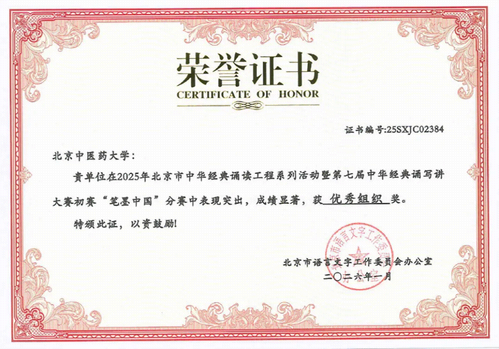 近日,北京市教育委员会、北京市语言文字工作委员会公布了2025年北京市中华经典诵读工程系列活动暨教育部国家语委第七届中华经典诵写讲大赛北京市初赛活动评选结果,公司以出色的赛事组织与参赛学子的优异表现,在“笔墨中国”分赛中荣获优秀组织奖。9名参赛同学斩获市级奖项,其中三等奖3名、优秀奖6名,充分展现了北中医学子的文化素养与人文风采。