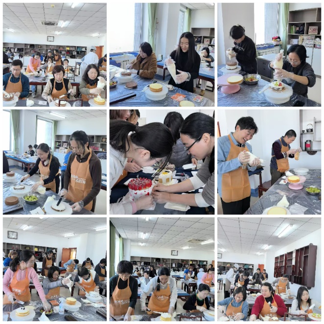 在专业糕点师的示范下,老师们积极动手,经过检查备品—夹层奶油水果—坯子表层奶油—创意装饰—打包等一系列环节,一个个色香味俱全的蛋糕缤纷出炉了!