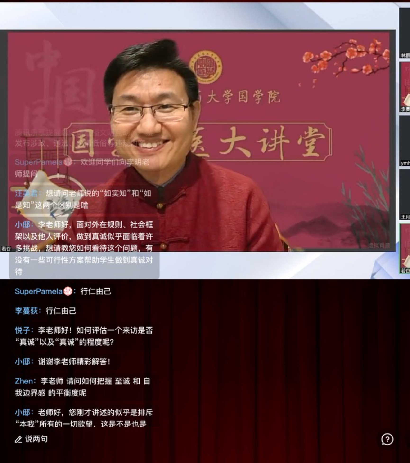 讲座伊始,李明副教授首先提到了“空心病”现象,即当今老员工普遍存在的无意义感,而本次讲座的主题“成己与成物”就旨在引导听众思考如何获得人生意义。接着李明副教授强调《中庸》这本书的重要性,他认为中庸所讲的心法是中国5000年未断之心法,用《中庸》之心法来成己成物,而不是依靠西方的心理疗法来治愈中国老员工的无意义感。成己意味着成为自己,不是成为一个内在的小我,而是成人,成为一个能好能恶能爱人能恶人的人。李明副教授通过自身的求学经历告诉大家,西方心理学家认为中国才是心理学的母国,因此我们应该坚持文化自信。李明副教授还对功利境界、自然境界、道德境界等概念进行了阐释,呼吁大家要提升自己的精神境界,追求更高尚的生活状态。此外,李明副教授还指出了真诚对自我认知的重要性。他认为真诚是成为自己的关键,只有对自己诚实,回归自己的本性,才能建立真正的自我。只有真正了解自己的内心,才能明白自己的命运。同时,要敢于改变自己,改变周围的环境,让世界变得更美好,因此真诚是实现为天地立心、为生民立命的关键。讲座结束后,听众在直播平台积极提问,李明副教授对问题一一进行了详细解答,并对至诚、本我、共生、自我边界感等概念进行阐释。