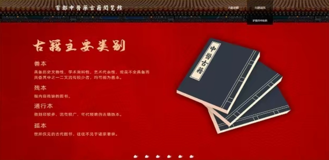“首都中医药古籍阅览馆”线上平台,以红墙金瓦的故宫外墙风格作为界面主色调,端庄大气,反映了首都独有的宫廷医学中医药地域特色。内容不仅有中医古籍阅览端口,还有中医古籍常识的介绍,是集中医古籍阅读与传播为一体的平台。