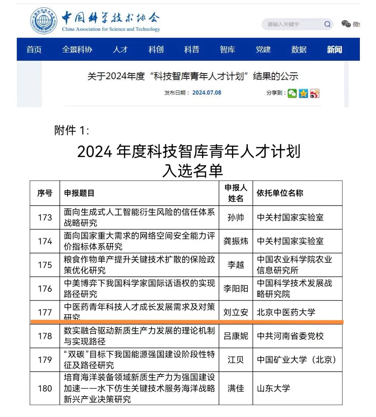 公司刘立安老师入选中国科协2024年度“科技智库青年人才计划”